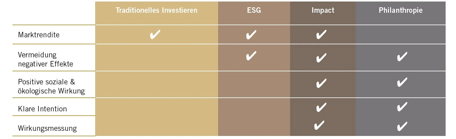 Impact Investing. Dieser Investitionsansatz geht noch einen Schritt weiter, denn neben der Berücksichtigung von ESG-Faktoren tätigt diese Anlagestrategie gezielt Investitionen, die neben einer finanziellen Rendite auch eine messbare positive Wirkung (Impact) erzielen. Man könnte hier von der „Kür“ des nachhaltigen Investierens sprechen. Das Impact Investing schließt somit die Lücke zwischen der traditionellen Kapitalanlage, die ausschließlich auf finanzielle Rendite abzielt und der Spende, die vor allem eine positive gesellschaftliche Wirkung fokussiert.